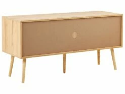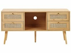Ein moderner, geräumiger TV-Möbel, der sich in jedem Wohnzimmer gut einfügt. Ausgestattet mit vier Schubladen bietet er reichlich Stauraum für sämtliches Zubehör sowie einen Platz für elektrische Geräte auf der offenen Ablage mit Kabelführungsloch. Vielseitig einsetzbar ist der helle Holzton, während die Vorderseiten aus Rattangeflecht für ein wenig Boho-Flair sorgen. Die Struktur besteht aus Spanplatten und MDF, während die Beine aus Kiefernholz gefertigt und mit Schutzkappen versehen sind.