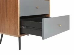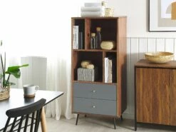 Ob als zusätzlicher Stauraum im Schlaf- und Ankleidezimmer oder als Abstellplatz im Ess- und Wohnzimmer, dieses Möbelstück kann überall universell eingesetzt werden. Sein Finish aus wunderschönem Eichenholzfurnier komponiert sich gut mit den grauen Schubladen, was dem Gesamtbild eine moderne und ansprechende Note verleiht. Die schmalen, schrägen Metallbeine in Schwarz geben dem Bücherregal eine hübsche Leichtigkeit.
