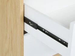 Ob als zusätzlicher Stauraum im Schlaf- und Ankleidezimmer oder als Abstellplatz im Ess- und Wohnzimmer, dieses Möbelstück kann überall universell eingesetzt werden. Sein Finish aus wunderschönem Eichenholzfurnier komponiert sich gut mit den weißen Schubladen, was dem Gesamtbild eine moderne und ansprechende Note verleiht. Die schmalen, schrägen Metallbeine in Schwarz geben dem Bücherregal eine hübsche Leichtigkeit.