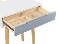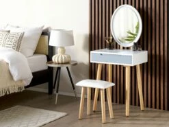 Mit diesem Schminktisch-Set können Sie sich Ihre eigene Schönheitsecke einrichten, selbst wenn Sie nur wenig Platz haben. Trotz seiner kompakten Größe ist dieser Tisch äußerst praktisch und verfügt über eine Schublade mit Trennfächern und einen Lichtspiegel. Der Rahmen ist mit einem LED-Panel ausgestattet, das natürliches, warmes oder kühles Licht ausstrahlt, so dass Sie die Lichtfarbe Ihren Bedürfnissen anpassen können. Der gepolsterte Hocker mit den passenden Beinen aus leichtem Gummibaumholz bietet einen bequemen Sitzplatz.