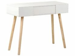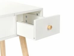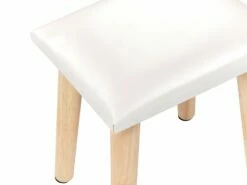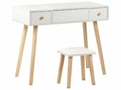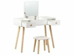 Bringen Sie zusätzlichen Wohnkomfort in Ihre tägliche Schönheitsroutine mithilfe dieses Schminktisch Sets. Es besteht aus einem funktionalen Tisch mit zwei Schubladen und einer aufklappbaren Platte, in der sich ein mittelgroßer Spiegel und zusätzlicher Stauraum befinden. Dazu gibt es einen Hocker mit passendem Kunstlederbezug, damit Sie sich beim Schminken bequem setzen können. Die weißen Vorderseiten und die dazu passenden Beine aus Gummibaumholz machen dieses Set zu einer modernen, minimalistischen Variante eines traditionellen Schminktisches.