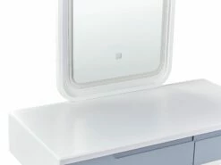 Mit seinem schlichten, minimalistischen Stil passt dieser Schminktisch in jedes moderne Schlafzimmer. Der aus robustem MDF gefertigte und auf Holzbeinen montierte Tisch verfügt über zwei Schubladen mit praktischen Fächern, die Ihnen helfen, Ihre Sachen zu ordnen. Der eingebaute Spiegel verfügt über einen Rahmen mit LED-Leuchten, die über einen Touch-Schalter auf der Glasfläche gesteuert wird. Die Frisierkommode und der Hocker mit Kunstlederbezug bilden ein stilvolles und funktionelles Set.