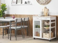 Dieses Möbelstück verbindet Funktionalität mit hübschem Design! Dank der Schranktür mit Fenster kann man einen Blick ins Innere des Servierwagens werfen – hier können vor allem Gläser und Weinflaschen schön in Szene gesetzt werden. Die zwei kleinen Körbchen sind ein perfekter Ort für frisches Obst oder Gemüse und in den zwei oberen Schubladen finden Küchenutensilien einen guten Platz. Der Rollwagen ist größtenteils in Weiß gestrichen und aus MDF gefertigt, mit einer kontrastierenden Platte aus hellem Gummibaumholz und einem Gestell aus Kiefernholz. Dank der Laufrollen lässt sich der Teewagen mühelos verschieben, sogar wenn er beladen ist.