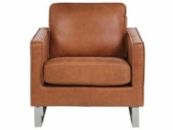 Dank der hochwertigen Verarbeitung bekommt der Sessel eine edle Ausstrahlung, die ins Auge fällt. Das angenehme Material aus Polyester in Lederoptik in Goldbraun sorgt für eine schöne Polsterung und komfortable Armlehnen. Die gewagten Metallkufen sichern einen festen Stand.