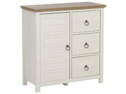 Mit diesen besonders rustikalen Möbel in dezentem Beige, moderner Eichenholz-Optik und runden Metallgriffen ist für einen auffälligen Akzent im Wohn- oder Schlafzimmer gesorgt. Vervollständigen Sie den Look des Sideboards mit verschiedenen Dekorationen und füllen Sie den Raum mit purer Gemütlichkeit. Die gesamte Konstruktion besticht mit mattem Finish und ist aus pflegeleichten, langlebigen Faserplatten und MDF gefertigt. Durch die optimale Einteilung, bietet es Ihnen immer einen geräumigen und praktischen Stauraum.