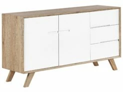Dieses schöne Aufbewahrungsmöbel im modernen Stil kann sowohl in minimalistischen, als auch skandinavischen Innenräumen wunderbar untergebracht werden. Auf der geräumigen Ablagefläche können Dekoschalen, Tischlampen, sowie Blumenvasen perfekt in Szene gesetzt werden. Die zwei Schränke und drei kompakten Schubladen bieten ausreichend Platz all Ihre Kleidungsstücke und privaten Accessoires wunderbar zu verstauen. Die trendige Kombination aus naturbelassener Holzoptik mit mattem Finish, weißem Furnier und hochwertigem Kiefernholz tränkt jeden Wohnraum in ein mondänes und frisches Ambiente.