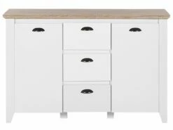Beim Anblick dieses zeitlos designten Sideboards werden alle Liebhaber des Landhausstils schwach. Die großzügige Ablagefläche in naturbelassener Holzoptik korrespondiert ausgezeichnet mit dem weißen Furnier des Möbelkörpers. In den zwei Schränken und drei Schubladen können all Ihre persönlichen Gegenstände, Kleidungsstücke und Accessoires problemlos verstaut werden. Die robusten Metallgriffe sind nicht nur äußerst praktisch, sondern verleihen dem Sideboard auch einen dekorativen Touch.