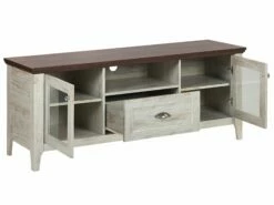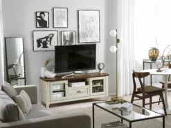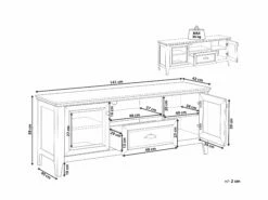 Viel Stauraum eingeschlossen in einem modernen Design! Stellen Sie ihren Flachbildschirm auf der breiten Tischplatte auf und benutzen Sie die zwei, großen Schränke um Ihre Weinflaschen oder Knabberzeug für den Fernsehabend stets in Reichweite zu haben. Zudem, können die Flügeltüren jeglichen Krimskrams sowie Spielekonsolen oder andere Geräte außerhalb des Blickfeldes halten. Durch seine kompakte Konstruktion kann das TV-Möbel auch als Kommode im Schlafzimmer oder Ablagefläche im Flur dienen.