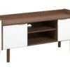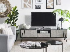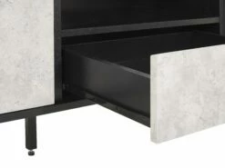 Die rechteckige Form und die dazu kontrastierenden, schrägen Füße verleihen diesem Möbelstück eine moderne Note mit viel Stil. Die Schrankfronten in Betonoptik harmonieren schön mit den matt schwarzen Flächen und machen das Lowboard zum hübschen und zugleich funktionellen Schrank für Ihr Wohnzimmer.