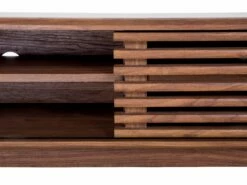 Unser Fernsehschrank wird Sie mit seinem ausgefallenen Design und dem warmen Walnussholzton begeistern. Dieses Schränkchen überzeugt durch eine elegante Ausstrahlung und hochwertige Qualität. Dieses Mediamöbel hat zwei Fächer mit jeweils einem höhenverstellbaren Einlegeboden. Mit einer kleinen Schiebetür lässt sich jeweils eines der beiden Fächer schließen. Die Holzstreben, welche in kleinen Abständen an der Schiebetür angebracht sind, geben dem Fernsehschrank einen offenen Charakter.