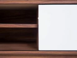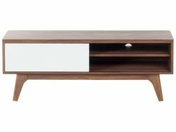 Der Fernsehschrank wird Sie mit seinem klassischen Design mit einer auffälligen Farbkombination begeistern. Der warme Walnussholzton harmoniert ausgezeichnet mit dem frischem Weiß. Dieses Schränkchen überzeugt durch eine elegante Ausstrahlung und hochwertige Qualität. Dieses Mediamöbel mit den Dimensionen 117x35x44 cm hat links ein Fach mit einer kleinen Schiebetür und auf der rechten Seite ein offenes Fach mit einem höhenverstellbaren Einlegeboden. Auch in dem linken Schrankfach können Sie einen Einlegeboden befestigen. Hierdurch werden Ihnen ungeahnte Stauraummöglichkeiten für z.B. DVDs und Zeitschriften geboten. Auch die große Abstellfläche ist sehr praktisch. Dieses wunderschöne Fernsehmöbel ist sehr vielseitig in der Nutzung und kann sowohl als Fernsehschrank, aber auch als Lowboard, Beistellschrank oder sogar als Tischchen genutzt werden. Sie werden von diesem Fernsehschrank begeistert sein – der nächste lange Fernsehabend kann kommen!