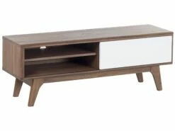 Der Fernsehschrank wird Sie mit seinem klassischen Design mit einer auffälligen Farbkombination begeistern. Der warme Walnussholzton harmoniert ausgezeichnet mit dem frischem Weiß. Dieses Schränkchen überzeugt durch eine elegante Ausstrahlung und hochwertige Qualität. Dieses Mediamöbel mit den Dimensionen 117x35x44 cm hat links ein Fach mit einer kleinen Schiebetür und auf der rechten Seite ein offenes Fach mit einem höhenverstellbaren Einlegeboden. Auch in dem linken Schrankfach können Sie einen Einlegeboden befestigen. Hierdurch werden Ihnen ungeahnte Stauraummöglichkeiten für z.B. DVDs und Zeitschriften geboten. Auch die große Abstellfläche ist sehr praktisch. Dieses wunderschöne Fernsehmöbel ist sehr vielseitig in der Nutzung und kann sowohl als Fernsehschrank, aber auch als Lowboard, Beistellschrank oder sogar als Tischchen genutzt werden. Sie werden von diesem Fernsehschrank begeistert sein – der nächste lange Fernsehabend kann kommen!