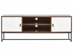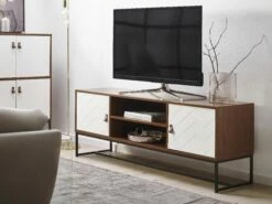 Diese elegantes und kompaktes TV-Möbel garantiert Ihnen viel Stauraum und nimmt gleichzeitig wenig Platz ein! Auf der oberen Ablagefläche im dunklen Holzfarbton können Vasen oder Bilderrahmen dekorativ platziert werden. Die zwei Türen sind mit einem trendigen Fischgrätenmuster bestückt und ermöglichen Ihnen alle Kleinigkeiten, Unterlagen und Accessoires an einer Stelle unterzubringen. Die pulverbeschichteten Metallbeine sind äußerst standfest und verleihen dem Möbelstück einen industriellen und innovativen Look.