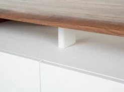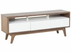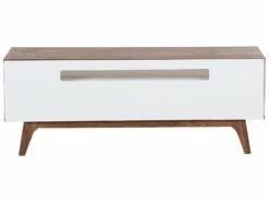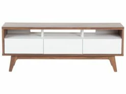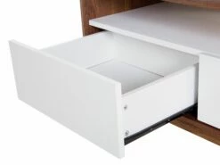 Der exklusive Fernsehschrank überzeugt durch schlichtes Design mit einer auffälligen Farbkombination. Der warme Walnussholzton harmoniert ausgezeichnet mit dem klassischen Weiß. Dieses Schränkchen begeistert durch eine elegante Ausstrahlung und hochwertige Qualität. Dieses Mediamöbel mit den Dimensionen 140x39x53 cm hat 3 geräumige Schubladen versehen von griffloser Tip-on Technik. Oberhalb der Schubladen befindet sich ein dekoratives offenes Fach mit einer breiten Öffnung auf der Rückseite für all Ihre Kabel.
