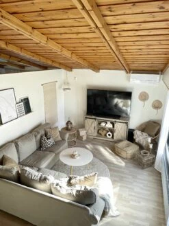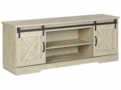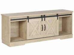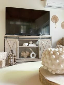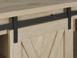 Dieses Lowboard besitzt zwei praktisch Regale und zwei Schränke mit Schiebtüren die all Ihre medialen Accessoires und Geräte verstauen und dabei für Ordnung im Wohnzimmer sorgen. Zudem überzeugt das Möbelstück mit seinem klassischen Design, dass an den Landhausstil erinnert – perfekt für Boho und rustikale Einrichtungen mit gemütlichem Touch.