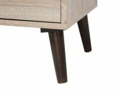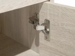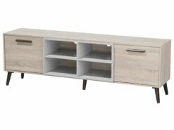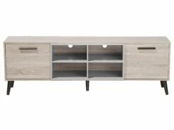 Stylisches Board mit unterschiedlichen Nutzungsmöglichkeiten – es kann sowohl als Mediamöbel, Kommode oder Lowboard dienen. Hinter den zwei aufklappbaren Schranktüren lassen sich verschiedene Gegenstände blickdicht aufbewahren und die kleinen Fächer mit graufarbenem Innenraum sind perfekt für Dekoelemente. Die zwei dunkelbraunen Griffe sowie die farblich abgestimmten Füße runden das Design des Möbelstücks ab.