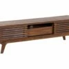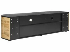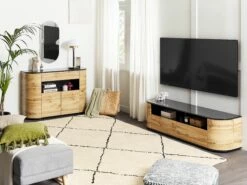 Um Ihr Wohnzimmer zu vervollständigen, brauchen Sie ein geeignetes Aufbewahrungsmöbelstück. Am besten ist es, wenn Sie sowohl ein funktionales als auch ein dekoratives Möbelstück kaufen – so wie diesen TV-Ständer. Er hat einen modernen, rustikalen Look und bietet mit 2 Ablageflächen und 2 geräumige Schubladen viel Stauraum. An den geschwungenen Seiten befinden sich Türen, hinter denen sich weitere Einlegeböden befinden. Wenn Sie einen Fernseher auf dem Sideboard platzieren möchten, werden Ihnen die speziellen Kabellöcher auf der Rückseite helfen. Der TV-Schrank ist zudem aus hochwertigem MDF gefertigt und somit pflegeleicht.