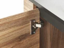 Verleihen Sie Ihrem Wohnbereich mit diesem niedrigen TV-Schrank einen stilvollen und klaren Look. Mit seinen 2 Schränken, 1 Regal und 1 Schublade liefert der Unterschrank nicht nur Platz für Ihr TV-Gerät, sondern auch für einen Decoder, DVD-Player, Dekoartikel sowie viele andere Kleinigkeiten. Die integrierte Kabeldurchführung an der Rückseite des Ablagefachs sorgt für einen geordneten Wohnbereich. Dank seiner hellen Holzoptik, die mit den schwarzen, matten Elementen der Konstruktion kontrastiert, ist das Sideboard eine ideale Ergänzung für alle modernen und industriellen Räume. Die Rückseite des TV-Boards verfügt über eine matte Melaminbeschichtung.