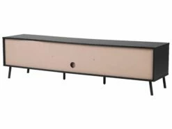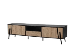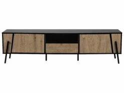 Die rechteckige Form und die dazu kontrastierenden, schrägen Füße verleihen diesem Möbelstück eine moderne Note mit viel Stil. Die Schrankfronten in Holzoptik harmonieren schön mit den matt schwarzen Flächen und machen das Lowboard zum hübschen und zugleich funktionellen Schrank für Ihr Wohnzimmer.