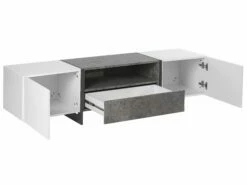 Dieses TV-Möbel ist die perfekte Kombination aus Stil und Funktionalität! Der Korpus in Betonoptik kontrastiert mit der weißen und glänzenden Farbe der 2 seitlichen Schränke und bildet das zentrale Hauptelement dieses Designs. Die breite Schublade bietet genügend Platz für jeglichen Krimskrams und im zusätzlichen Fach können Sie Ihre Heimelektronik unterbringen. Der Charme dieses Modells wird durch die mehrfarbige LED-Beleuchtung unterstrichen, welche seine klaren Linien und die ultra-elegante, außergewöhnliche Ausstrahlung noch verstärkt.