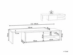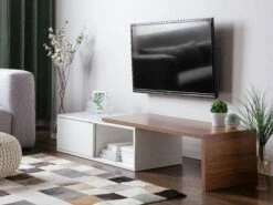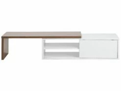 Dieser elegante Tisch bietet mehr als genug Platz für Ihr TV-Gerät und wird mit seinem modernen Design Ihrer Einrichtung einen Hauch von Stil verleihen. Die geräumigen und breiten Regalflächen bieten Ihnen zusätzlichen Stauraum, um verschiedene Gegenstände wie DVDs, CDs oder Spielekonsolen unterzubringen. Der TV-Schrank ist aus robustem, pflegeleichtem MDF gefertigt.