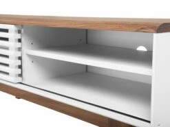Unser Fernsehschrank wird Sie mit seinem ausgefallenen Design und der schöner Farbekombination begeistern. Dieses Schränkchen überzeugt durch eine elegante Ausstrahlung und hochwertige Qualität. Dieses Mediamöbel hat zwei Fächer mit jeweils einem höhenverstellbaren Einlegeboden. Mit einer kleinen Schiebetür lässt sich jeweils eines der beiden Fächer schließen. Die Holzstreben, welche in kleinen Abständen an der Schiebetür angebracht sind, geben dem Fernsehschrank einen offenen Charakter.