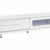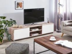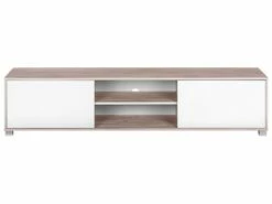 Dieses TV-Möbel wird Ihren Wohnraum wirklich erfrischen. Mit seinem minimalistischen Design und klaren Linien passt es perfekt zu jedem modern oder skandinavisch inspirierten Interieur. Es bietet zwei tiefe, blickdichte Schränke und mittig gelegene, offene Regale zur Aufbewahrung von DVDs, Videospielen und Kleinigkeiten. Auf der breiten, oberen Abstellfläche finden Ihr Fernseher, Lautsprecher oder sogar eine Soundbar einen sicheren Platz.