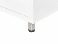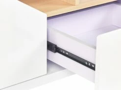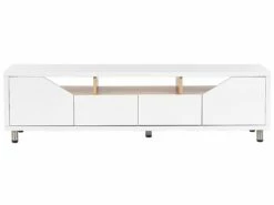 Dieser skandinavische TV-Unterschrank ist ein Möbelstück, das in keinem Wohnzimmer fehlen darf. Er bietet viel Platz für jegliche Kleinigkeiten sowie für Ihre Elektrogeräte. Nutzen Sie die offenen Fächer für alles, was Sie an die Steckdose anschließen möchten, und verstauen Sie alle anderen Gegenstände in einem der Schränke oder einer der Schubladen. Die weißen Hochglanzfronten, helle Holzoptik und die silbernen Füße aus Edelstahl verleihen dem Möbel einen stilvollen, modernen Look. Die Rückseite des TV-Boards verfügt über eine passende, matte Melaminbeschichtung.