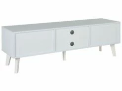 Dieser funktionale TV-Schrank ist das perfekte Möbelstück im Retro-Stil, das jedes Wohn- oder Schlafzimmer ergänzt. Zwei Ablagen und zwei schließbare Schränke bieten viel Platz für Zubehör, das Sie immer griffbereit haben möchten. Die Durchführungen auf der Rückseite erleichtern den Anschluss elektronischer Geräte. Die Möbelfronten mit einem markanten Rattangeflecht sowie die Messinggriffe sorgen für einen Vintage-Touch. Die Kombination aus Cremeweiß und Beige macht das Möbelstück zu einer idealen Ergänzung für skandinavische, Boho und minimalistische Interieurs. Die MDF-Konstruktion macht das Möbelstück robust und langlebig.
